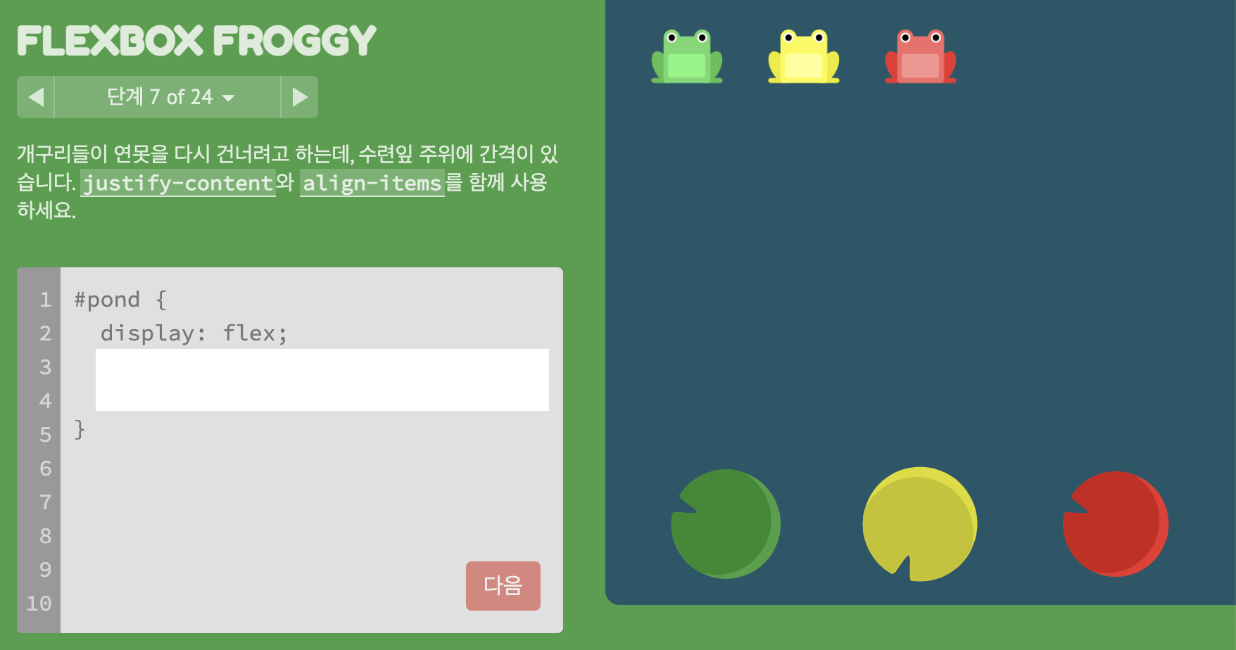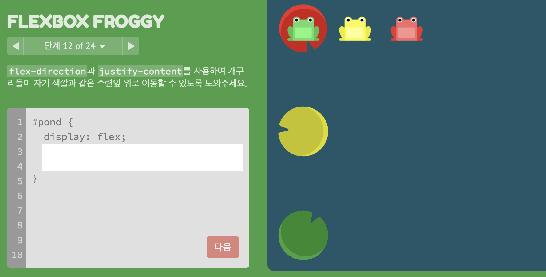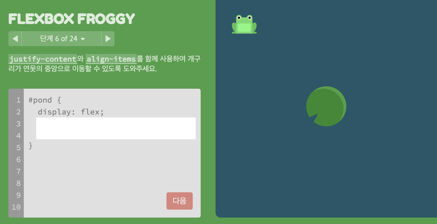 * FLEXBOX FROGGY 이동 https://flexboxfroggy.com/#ko