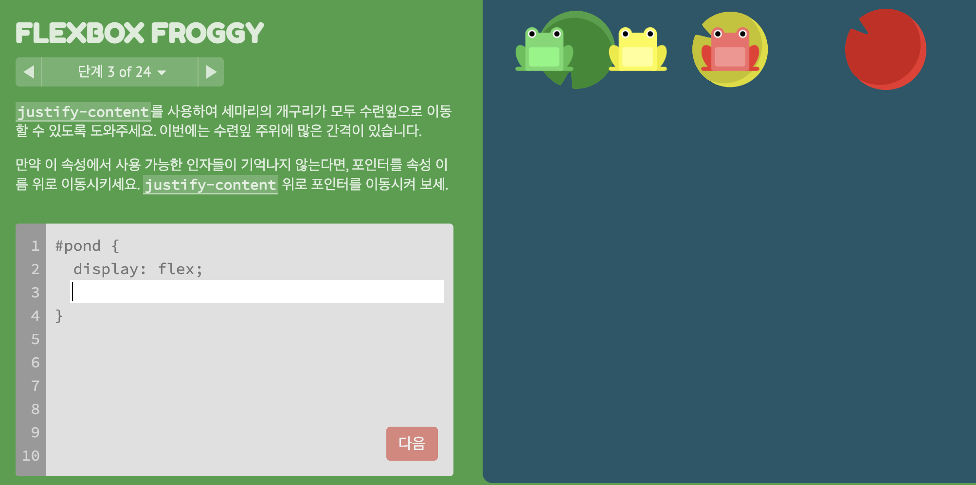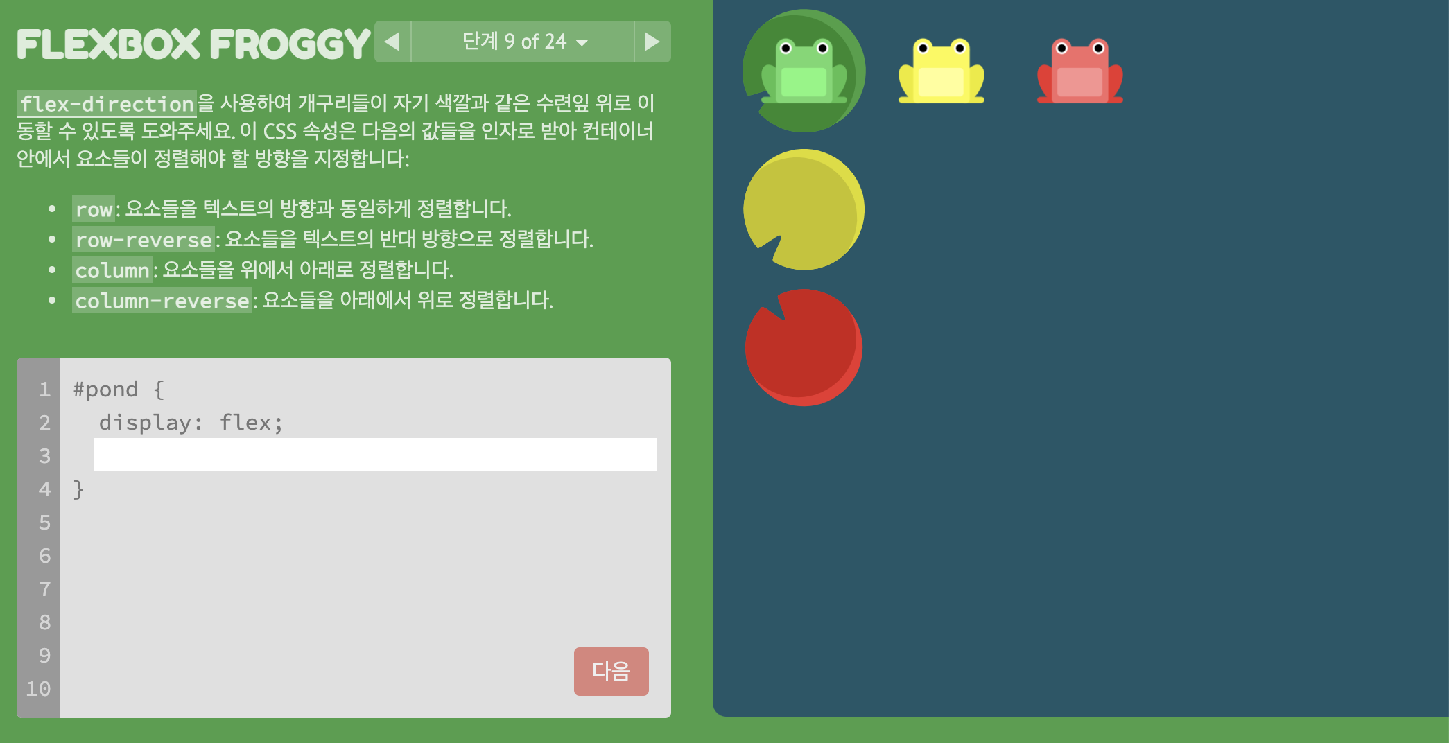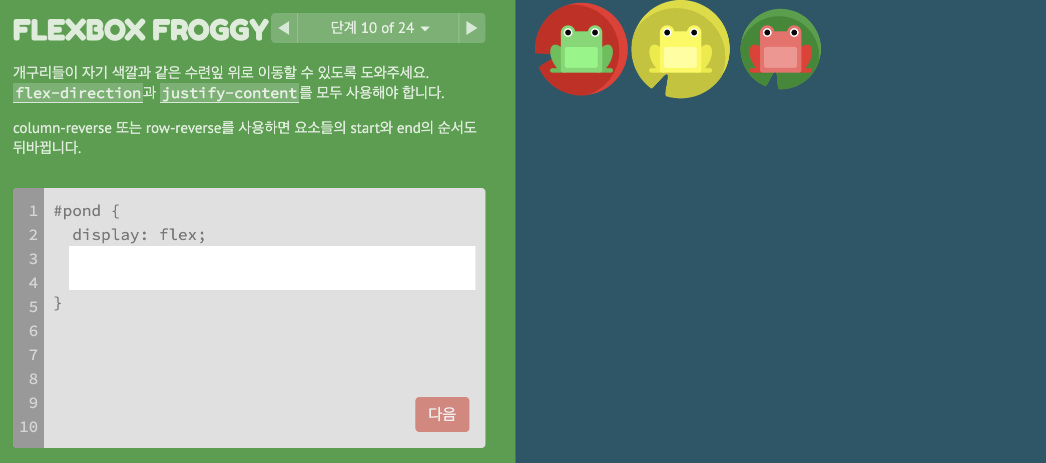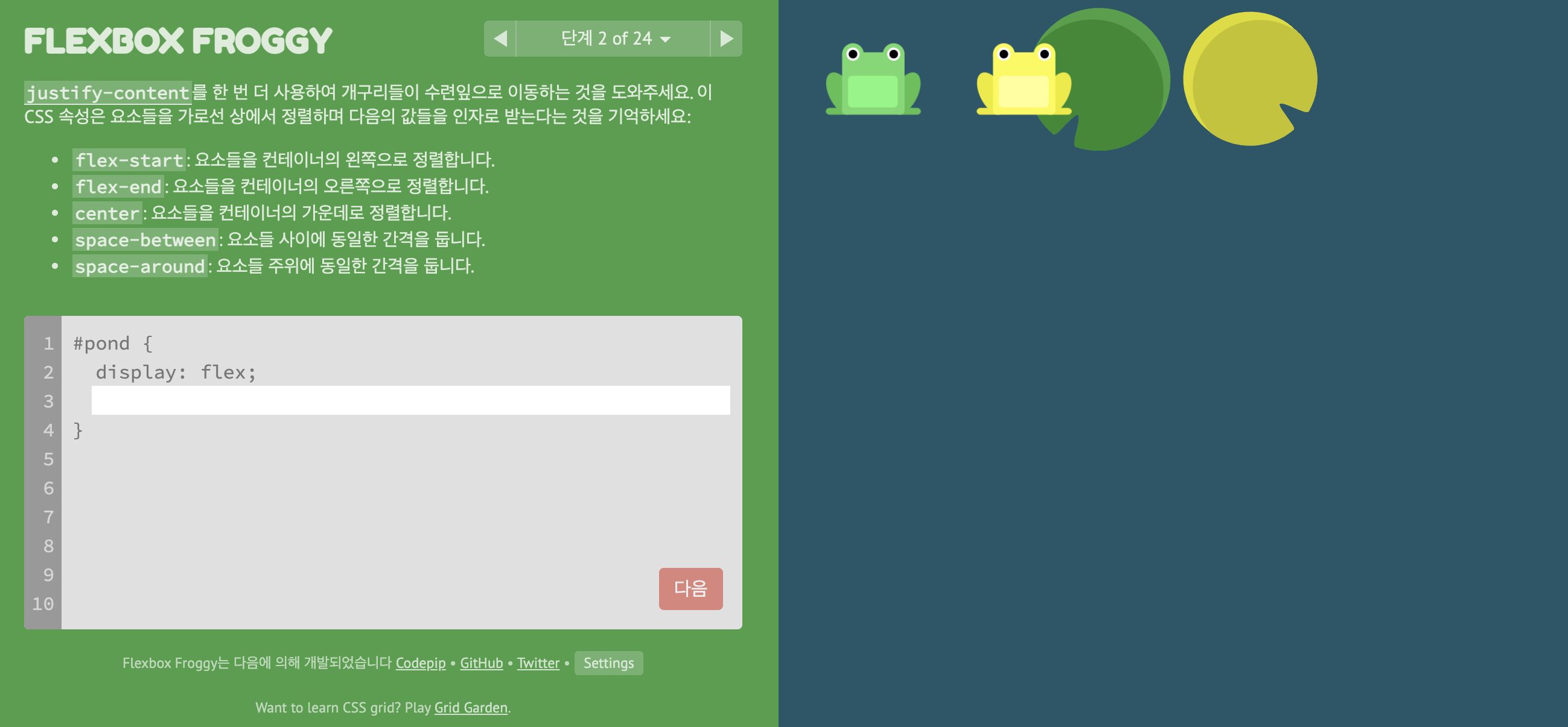 * FLEXBOX FROGGY 이동 https://flexboxfroggy.com/#ko
