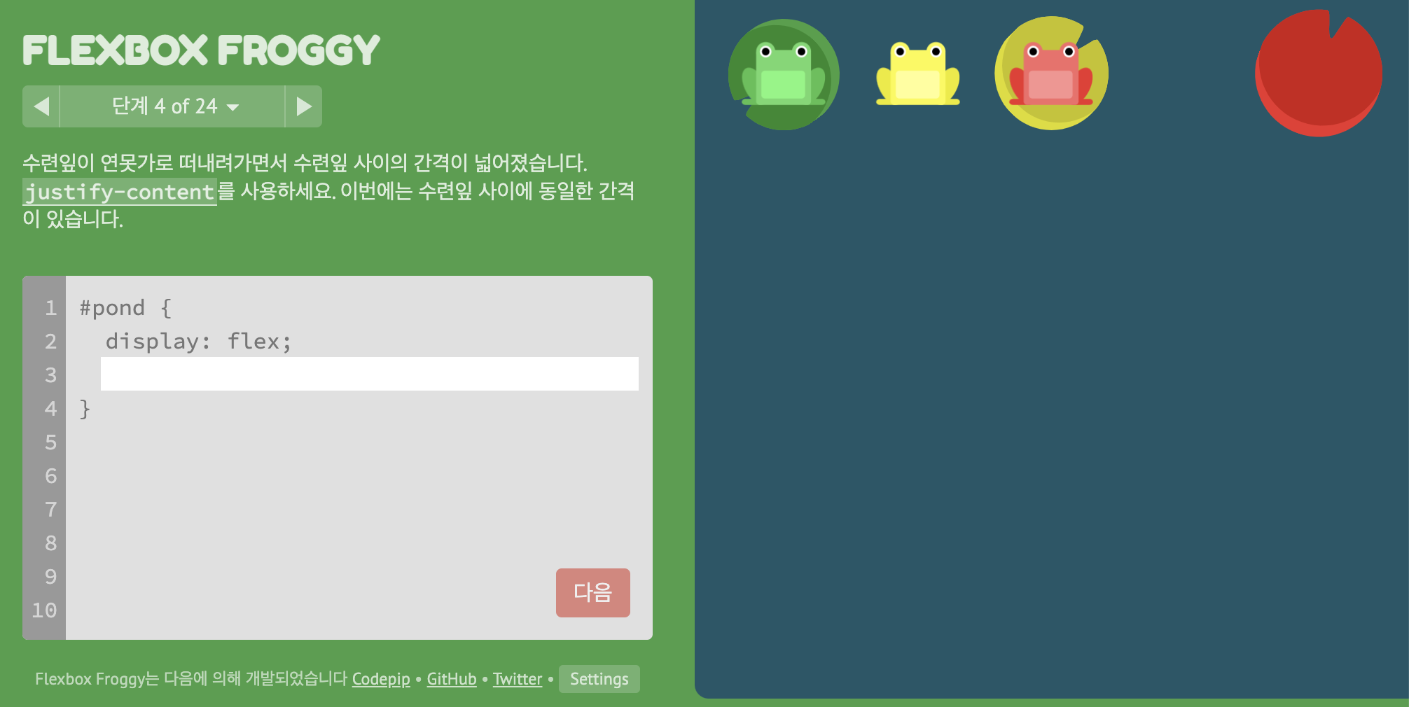 CSS코드 게임으로 Flexbox의 속성을 요구한대로 입력하면 다음 단계로 넘어갈 수 있는 게임